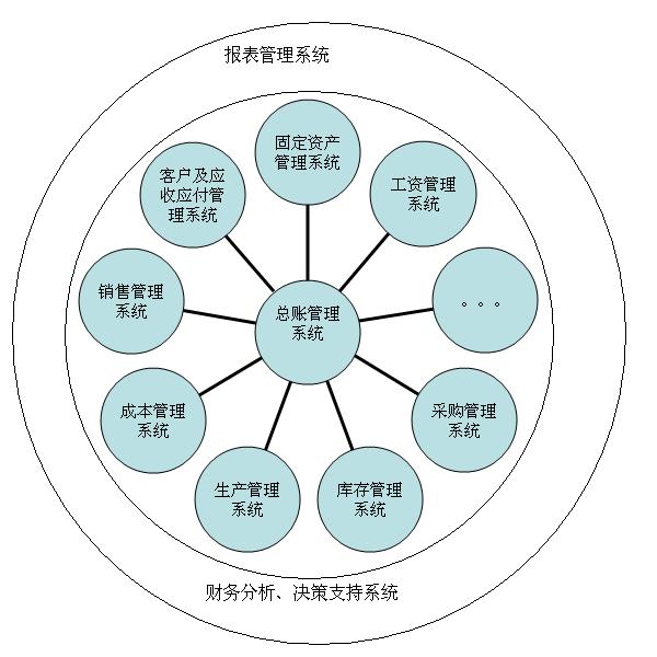 總賬管理系統(tǒng)、固定資產(chǎn)管理系統(tǒng)、資金管理系統(tǒng)、采購管理系統(tǒng)、庫存管理系統(tǒng)、生產(chǎn)管理系統(tǒng)、成本管理系統(tǒng)、銷售管理系統(tǒng)、工資管理系統(tǒng)、客戶及應(yīng)收應(yīng)付管理系統(tǒng)、報表管理系統(tǒng)、財務(wù)分析系統(tǒng)、決策支持系統(tǒng)等。